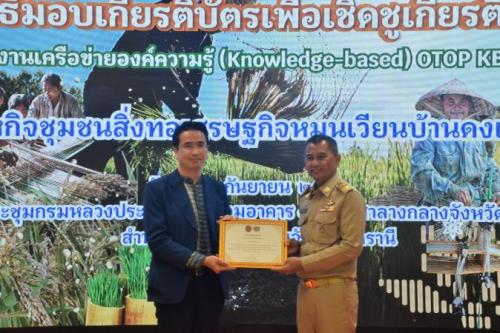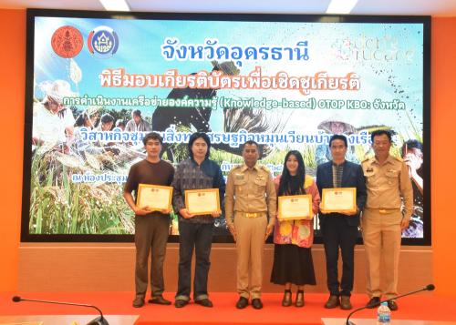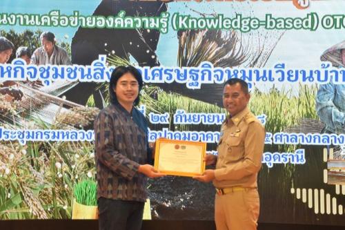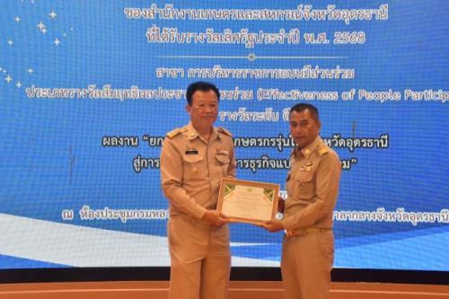 ก่อนเริ่มวาระการประชุม สำนักงานพัฒนาชุมชนจังหวัดอุดรธานี ได้มอบเกียรติบัตรให้แก่ผู้ประกอบการที่เข้าร่วม โครงการส่งเสริมกระบวนการเครือข่ายองค์ความรู้ (Knowledge - base OTOP : KBO) เพื่อยกระดับผลิตภัณฑ์ OTOP ให้มีคุณภาพและมูลค่าเพิ่ม ด้วยการนำองค์ความรู้และนวัตกรรมมาใช้ในการพัฒนาผลิตภัณฑ์ จำนวน 5 ราย ซึ่ง วิสาหกิจชุมชนสิ่งทอเศรษฐกิจหมุนเวียนบ้านดงเรือง ได้รับรางวัลรองชนะเลิศ อันดับ 2 ของประเทศ เป็น 1 ใน 5 กลุ่ม นอกจากนี้สำนักงานพัฒนาชุมชนจังหวัดอุดรธานี โดยพัฒนาการจังหวัด ได้รับมอบเกียรติบัตรจากสำนักงานเกษตรและสหกรณ์จังหวัดอุดรธานี ในนามหน่วยงานภาคีเครือข่ายที่สนับสนุนและมีส่วนร่วมในงานส่งผลให้สำนักงานเกษตรและสหกรณ์จังหวัดอุดรธานีได้รับรางวัลเลิศรัฐ ประจำปี พ.ศ. 2568