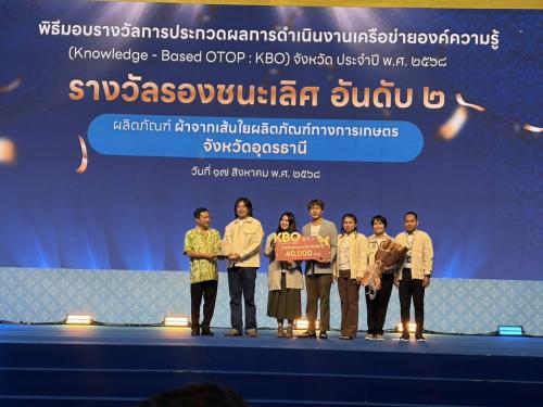 นายภควัตร คำพวง พัฒนาการจังหวัดอุดรธานี มอบหมายให้ นางภัทราวดี หมั่นเรียน ผู้อำนวยการกลุ่มงานส่งเสริมการพัฒนาชุมชน ร่วมกับเครือข่ายองค์ความรู้ KBO ผู้ผลิต ผู้ประกอบการ OTOP เจ้าของผลิตภัณฑ์กลุ่มวิสาหกิจชุมชนสิ่งทอเศรษฐกิจหมุนเวียนบ้านดงเรือง ตำบลผาสุก อำเภอกุมภวาปี จังหวัดอุดรธานี ขึ้นรับรางวัลการประกวดผลการดำเนินงานเครือข่ายองค์ความรู้ (Knowledge - Based OTOP : KBO) จังหวัดประจำปี พ.ศ.2568 จังหวัดอุดรธานี ได้รับรางวัล รองชนะเลิศอันดับ 2 ณ เวทีกลาง อาคารชาเลนเจอร์ 2 ศูนย์แสดงสินค้าและการประชุมอิมแพค เมืองทองธานี